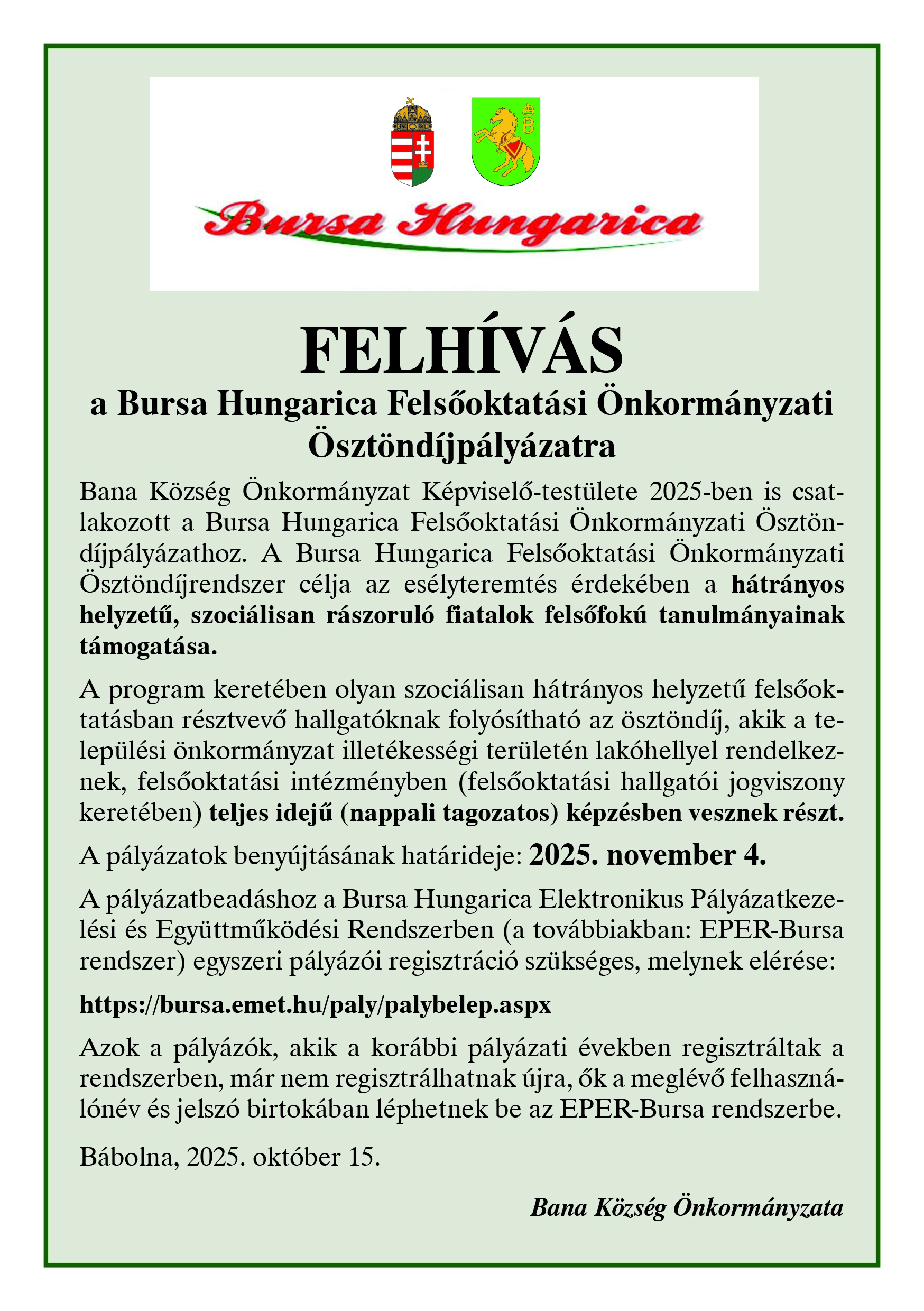 A pályázat beadásához a Bursa Hungarica Elektronikus Pályázatkezelési és Együttműködési Rendszerben (a továbbiakban: EPER-Bursa rendszer) egyszeri pályázói regisztráció szükséges, melynek elérése: https://bursa.emet.hu/paly/palybelep.aspx