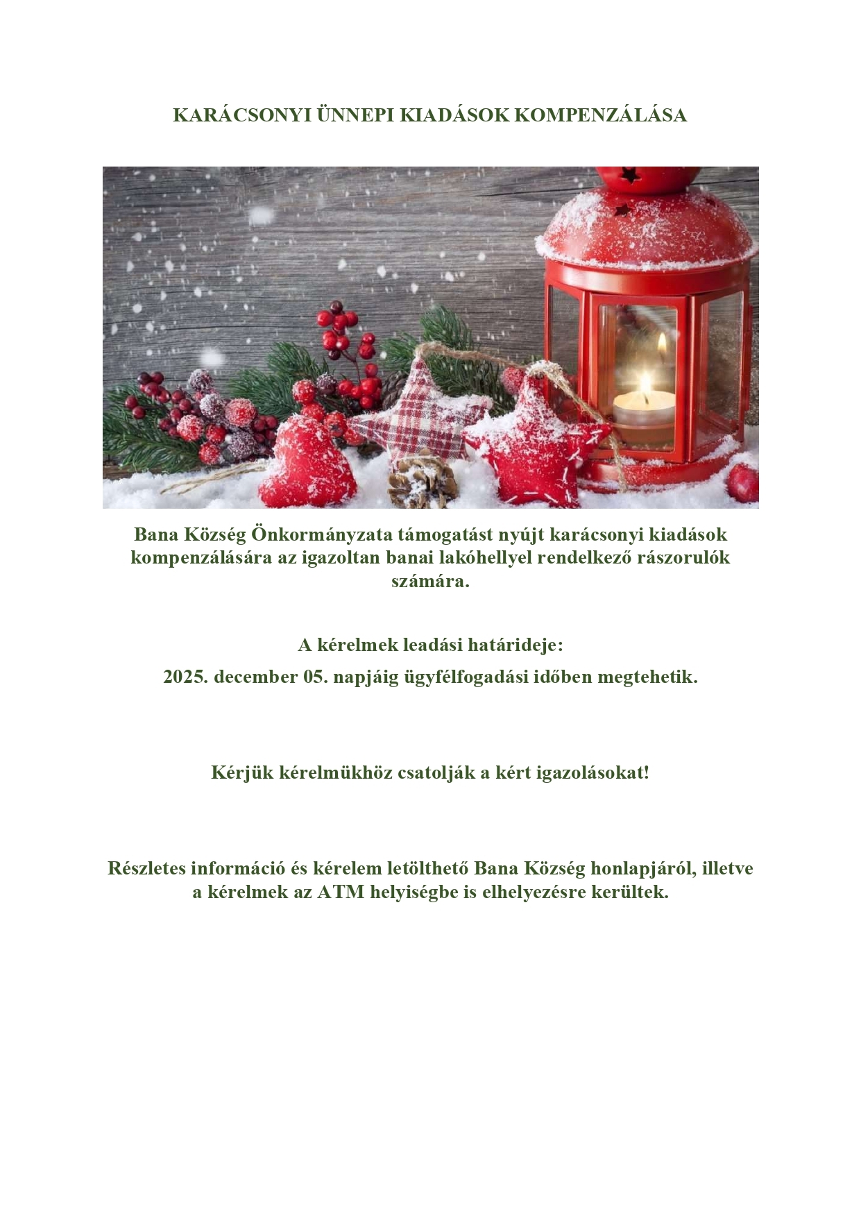 Bana Község Önkormányzata támogatást nyújt karácsonyi kiadások kompenzálására az igazoltan banai lakóhellyel rendelkező rászorulók számára.