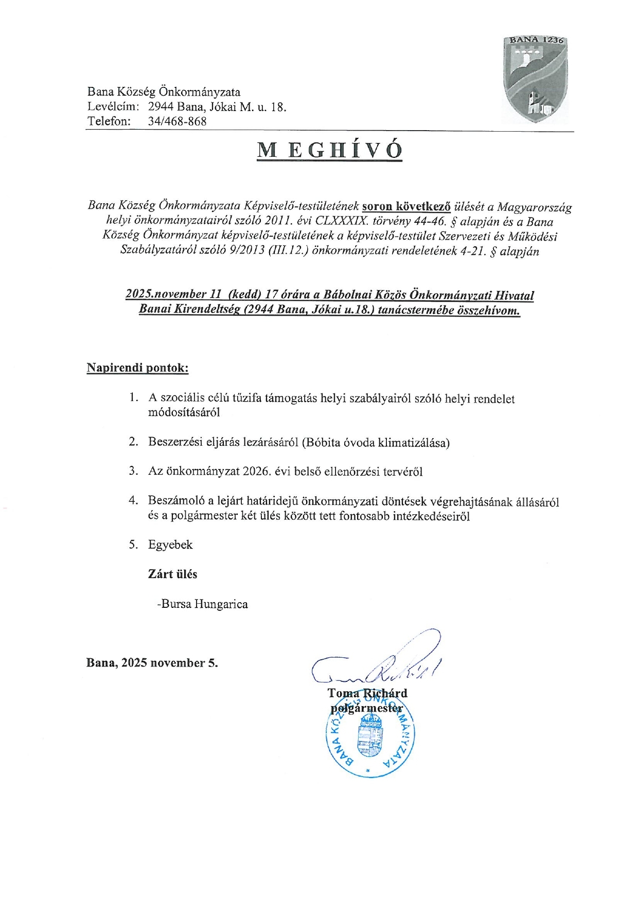 Bana Község Önkormányzata Képviselő-testületének soron következő ülését a Magyarország helyi önkormányzatairól szóló 2011. évi CLXXXIX. törvény 44-46. § alapján és a Bana Község Önkormányzat képviselő-testületének a képviselő-testület Szervezeti és Működési Szabályzatáról szóló 9/2013 (III.12.) önkormányzati rendeletének 4-21. § alapján